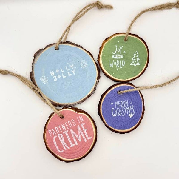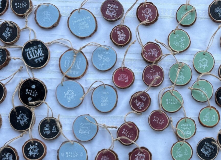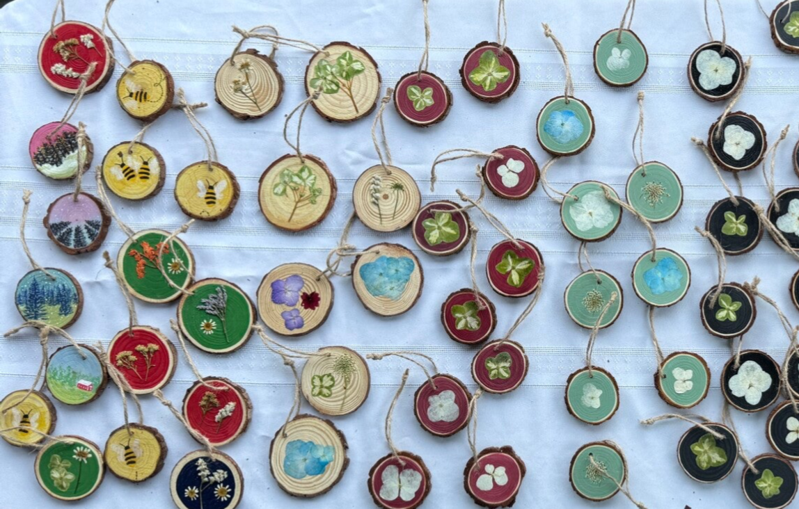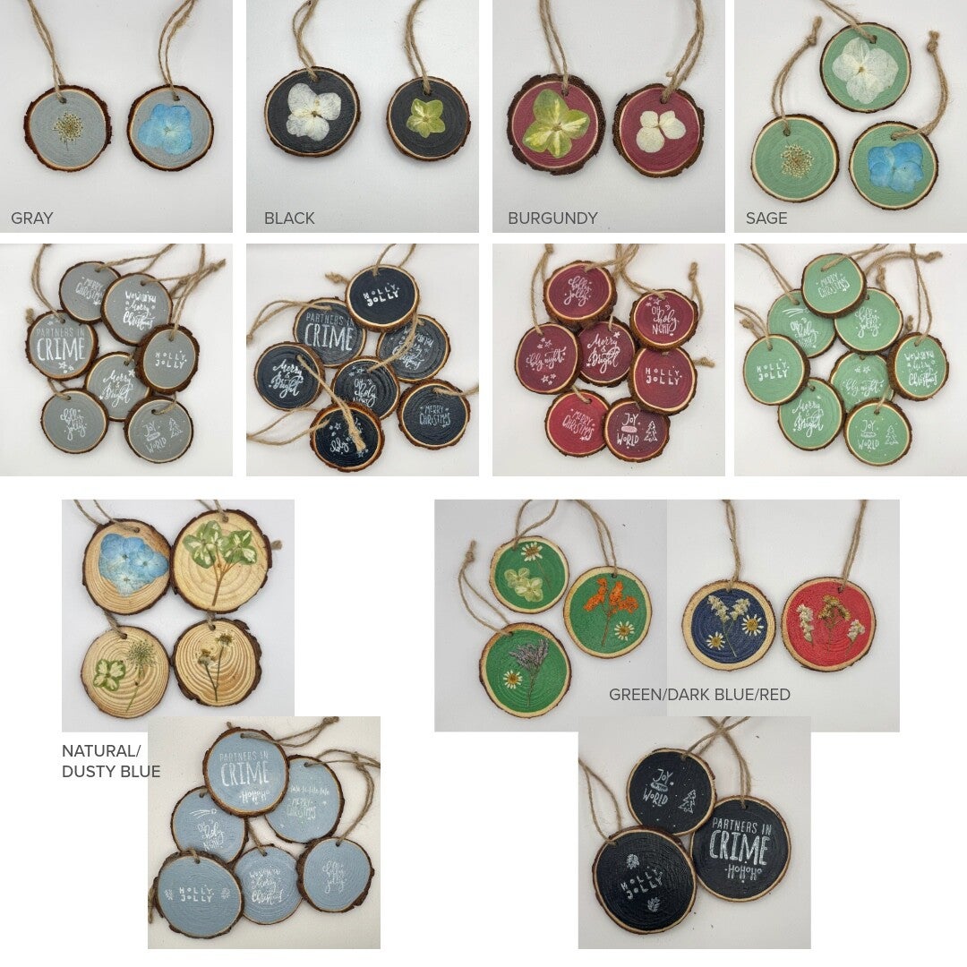 Ornaments with flowers will have a flower on one side and a Christmas message on the other side.