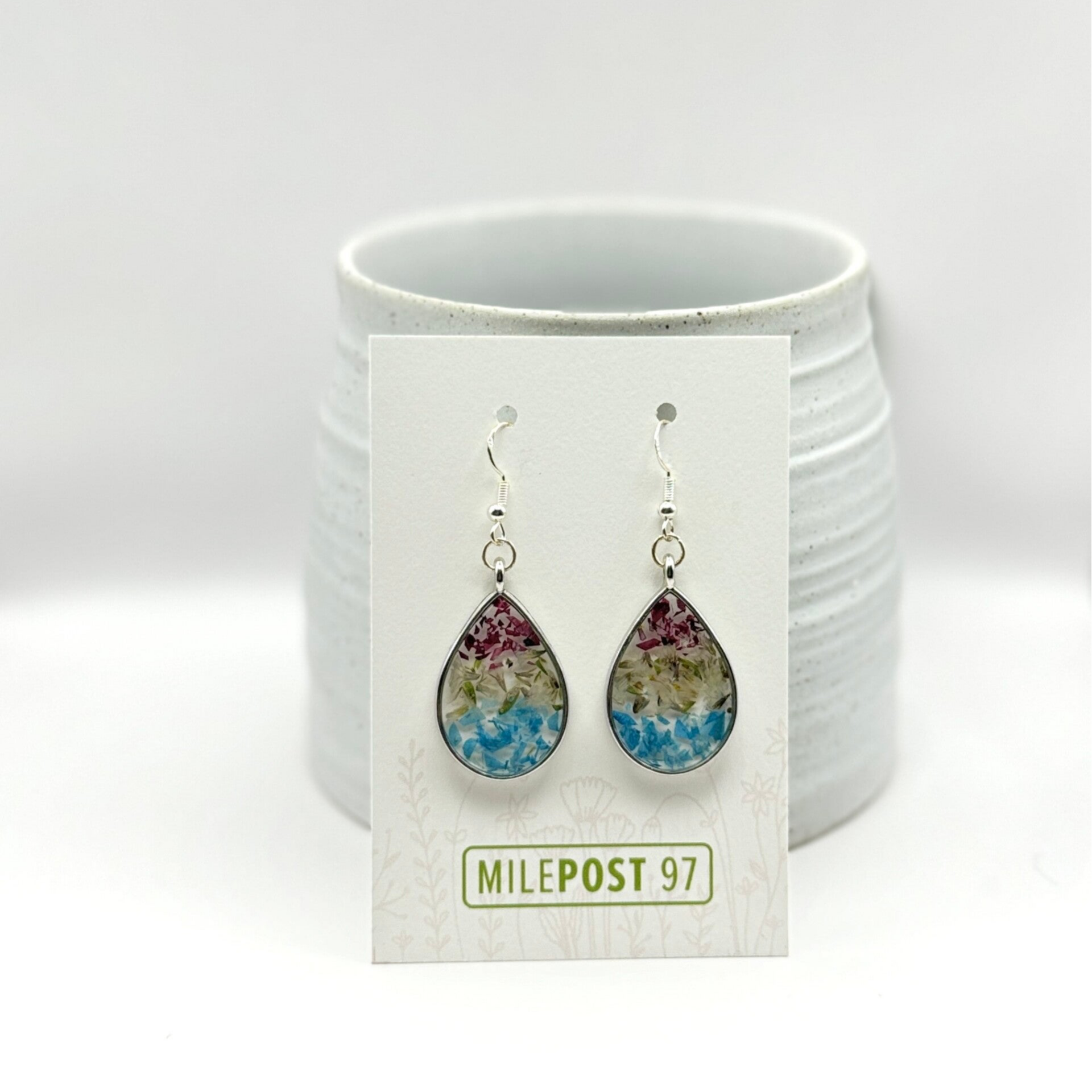 Red, White and Blue inspired Earrings. A variety of colored flower petals and Eucalyptus leaves delicately arranged in resin.