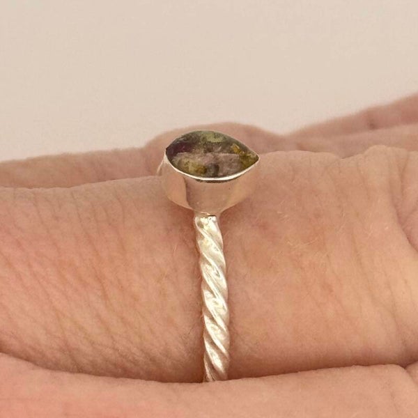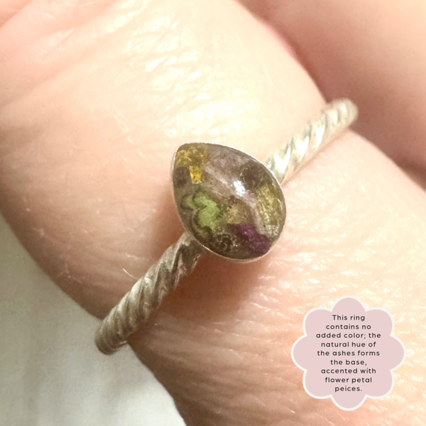 The keepsake stone is set in a 6x4mm or 7x9mm sterling silver pear bezel. Each ring is custom-designed to preserve the memory of a special day or honor a loved one, creating a timeless keepsake.