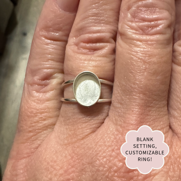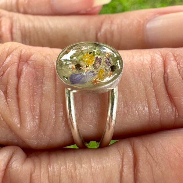 The keepsake stone is set in a 8x10mm sterling silver round bezel. Each ring is custom-designed to preserve the memory of a special day or honor a loved one, creating a timeless keepsake.