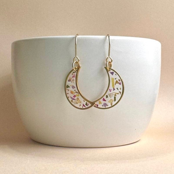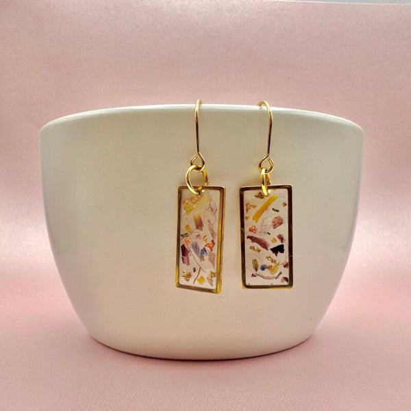 A variety of colored flower petals and Eucalyptus leaves delicately arranged in resin.