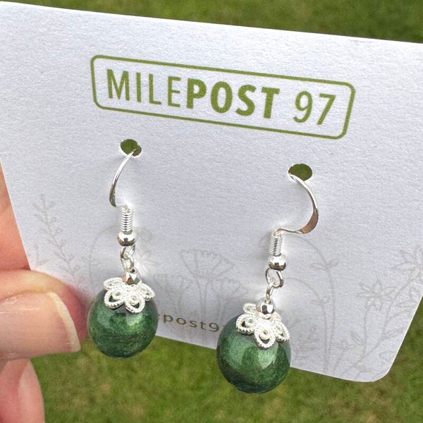 The keepsake resin bead is 12mm diameter and is paired with sterling silver French hooks. Each jewelry piece is accented with a sterling silver bead cap, eye pin, and a hematite bead for an elegant, finished look. While any base color can be used, it is important to bear in mind, the color may alter slightly once ashes are combined.
