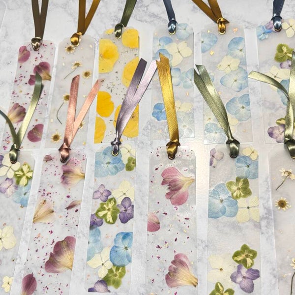 Each card features a clear front and a translucent back, delicately embellished with pressed flowers and finished with a coordinating silk ribbon.