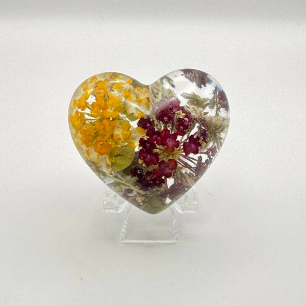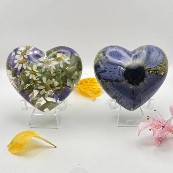 Delicately crafted 3D heart figures, designed with care and precision. These elegant, crystal-clear hearts are made from high-quality resin and beautifully accented with dried flowers and optional metallic flakes.