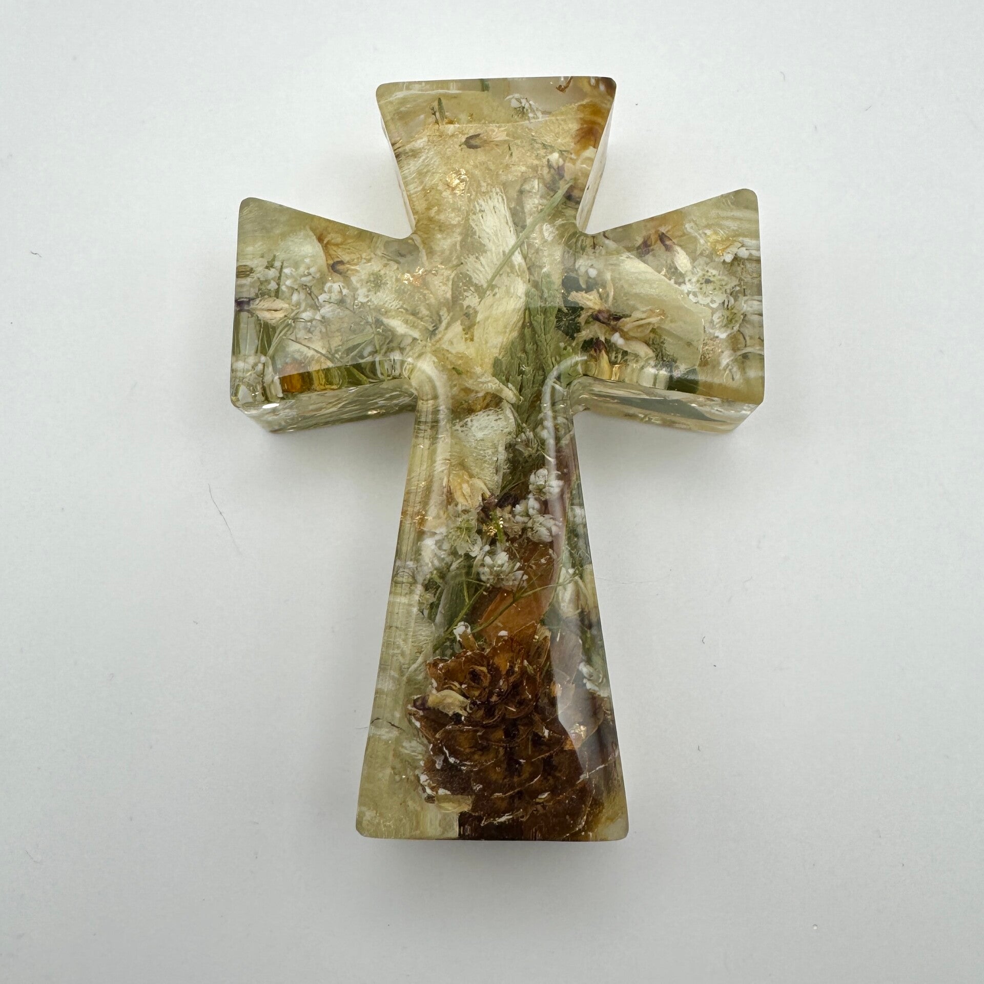 Delicately crafted cross figure, designed with care and precision and beautifully accented with your dried flowers and optional metallic flakes.