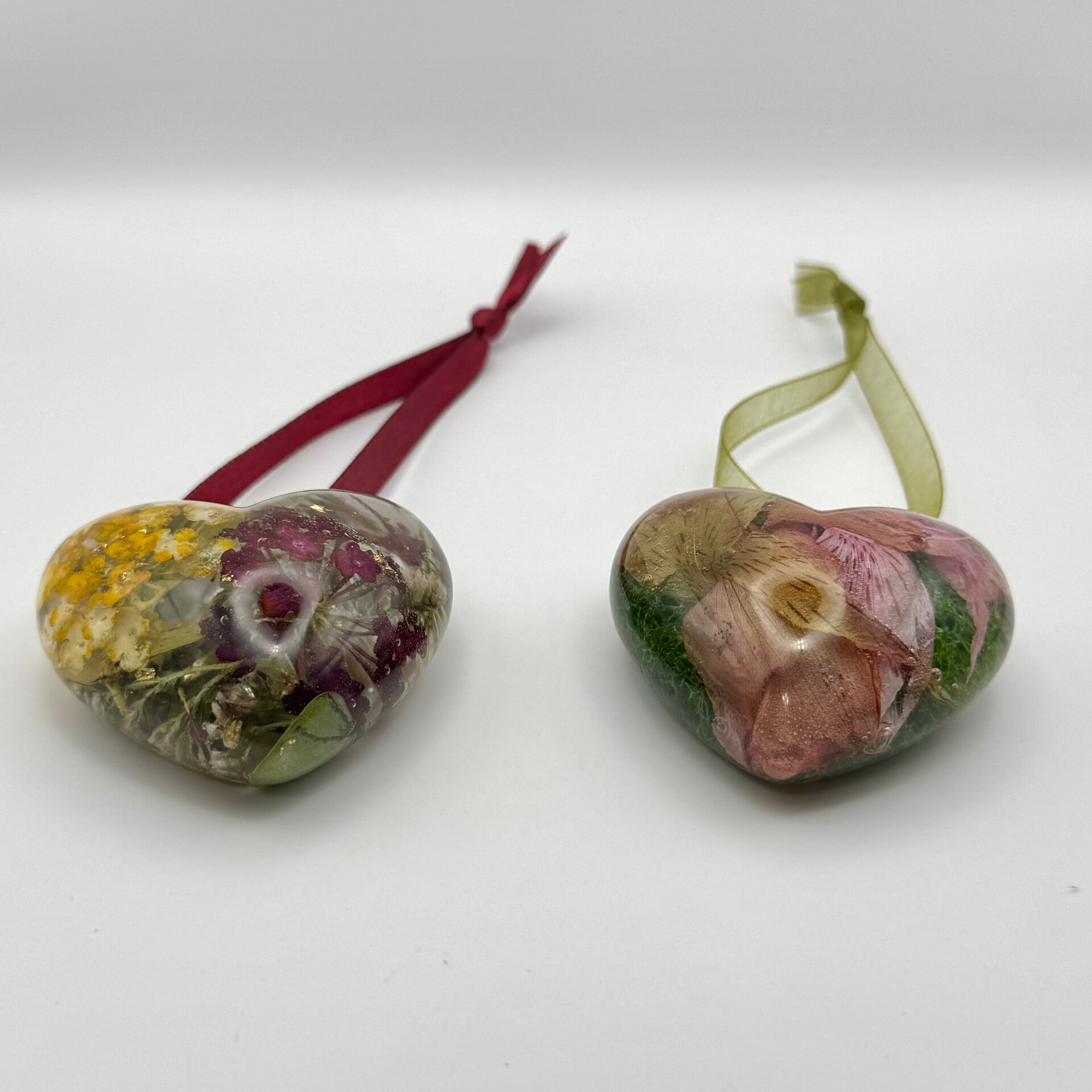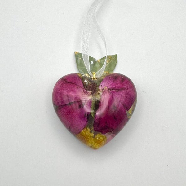 These 3d heart ornaments are lovingly handcrafted from high-quality resin and preserved flowers, with the option to add metallic flakes. Each piece is created with care to hold memories close—a timeless keepsake for celebrating life’s milestones or honoring the memory of a loved one.