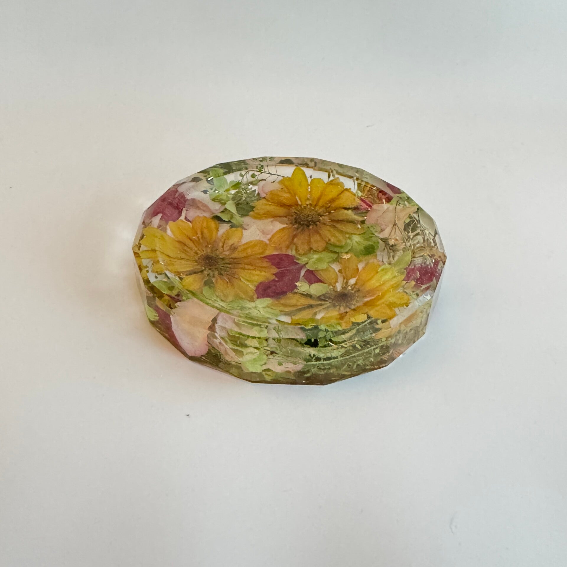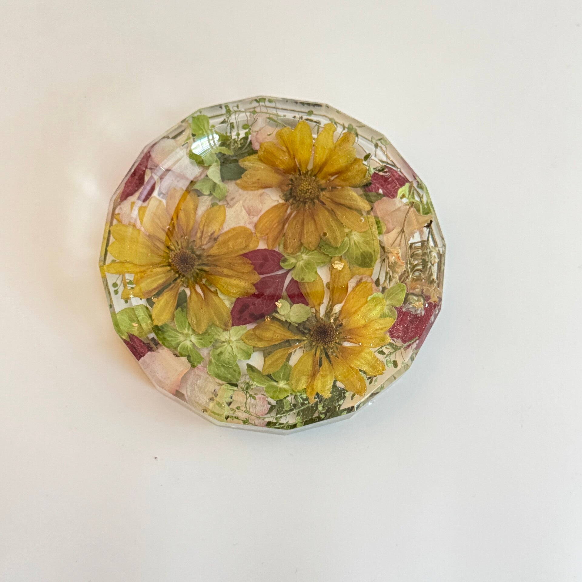 Beautiful faceted jewelry dish handcrafted with your preserved flowers from a funeral, wedding, birthday, or other special occasion. Each piece is made with care to hold memories close—a timeless keepsake to celebrate life’s milestones or to honor the memory of a loved one.