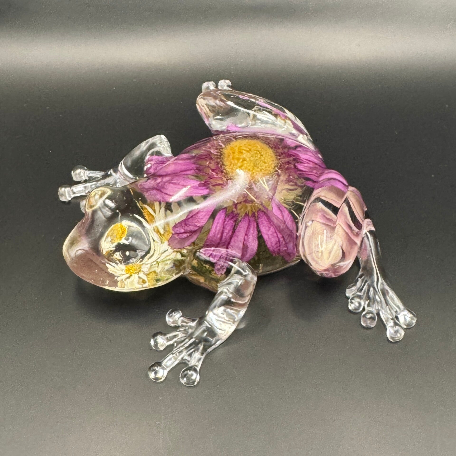 Delicately crafted resin frog figurine, designed with care and precision and beautifully accented with your dried flowers and optional metallic flakes.
